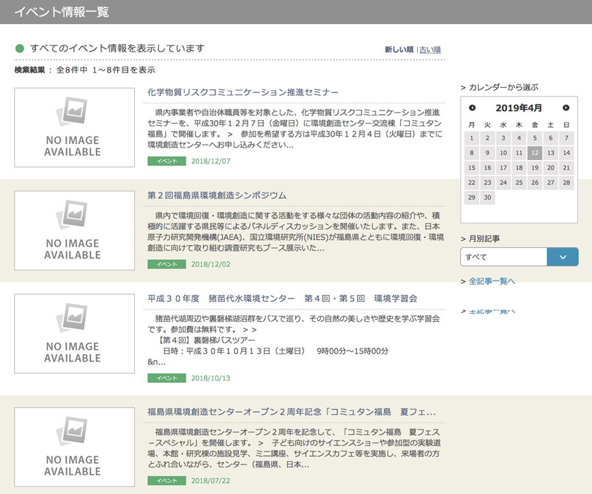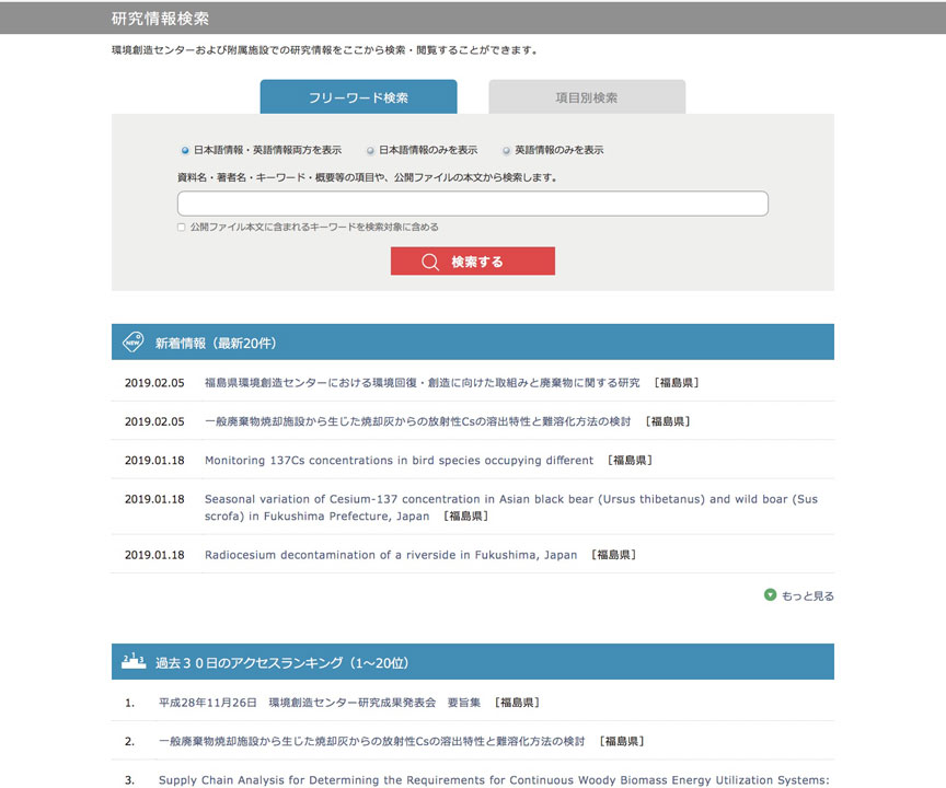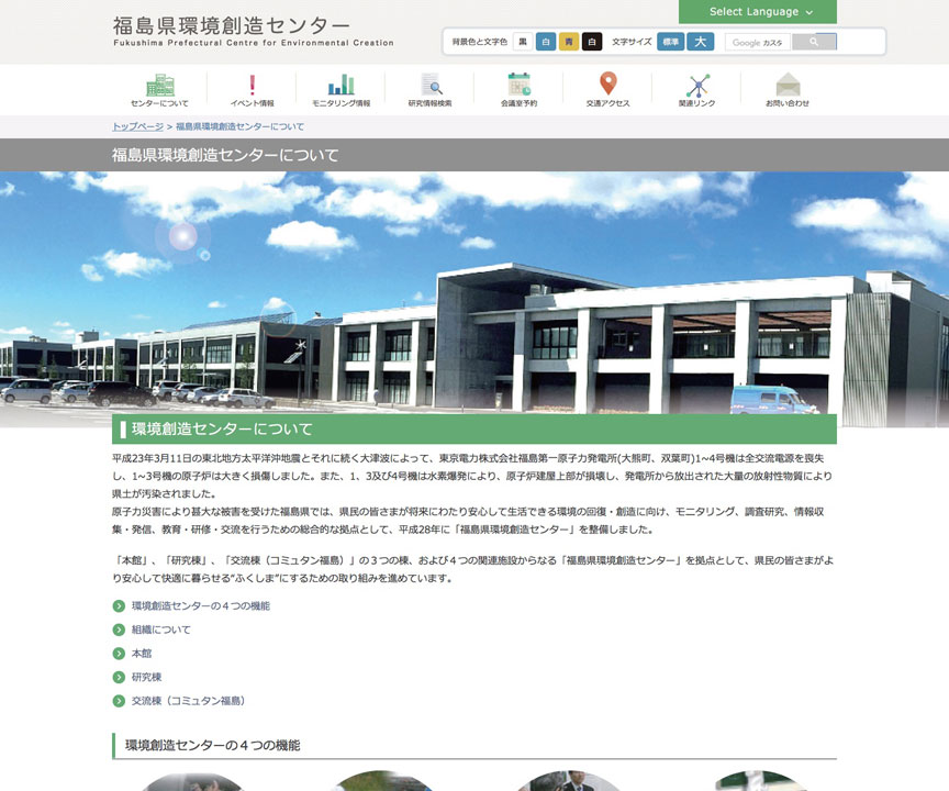 登録されている研究情報を検索するための全文検索システムの導入をはじめ、施設内の貸し会議室を予約するカレンダーシステムの構築、イベント情報を公開するための更新システムの実装、福島県内の放射線に関するモニタリングシステムとの連携など、施設利用者が必要とする機能を充たしています。